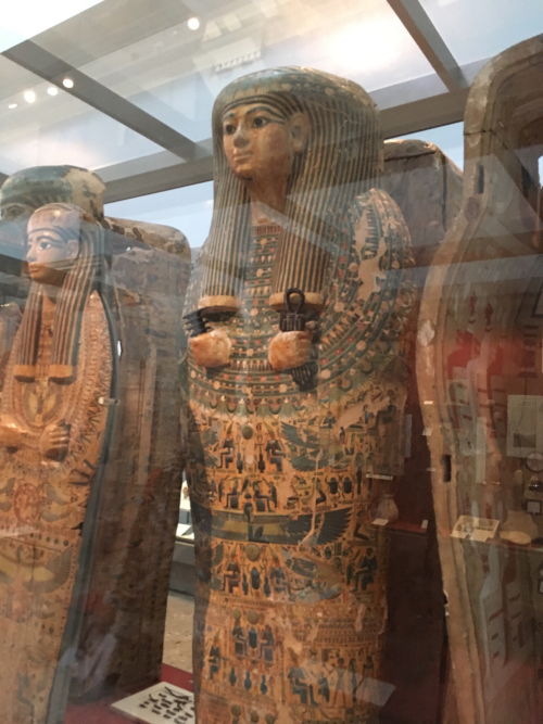The Egyptian artifacts are so numerous as to be overwhelming. We had young ones, remember, so we could not give each item a very close scrutiny, but I left with a strong impression of the painted and carved funerary objects as items crafted by real people with individual styles and hands. The picture-words aren’t printed or stamped, each bird and stream of water isn’t the same as each other; there is a fleeting imperfection to each one, as in pop art paintings where the artist has reproduced some scrap of text in the Courier font by hand-drawing and inking each enlarged letter-form.