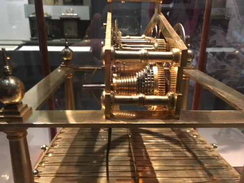 In turn, he pointed out to me a springed, chain-driven clock, the chain wound about an axle whose diameter changed as the spring ran down. “The axle profile is a graph of the changing force expected from the spring,” he said. Indeed.