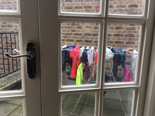 I hung up the still-damp laundry, still hot and moist from the “dryer.” There was a little sun, and I thought perhaps it might evaporate some more of the moisture outside.