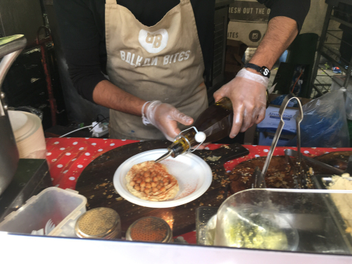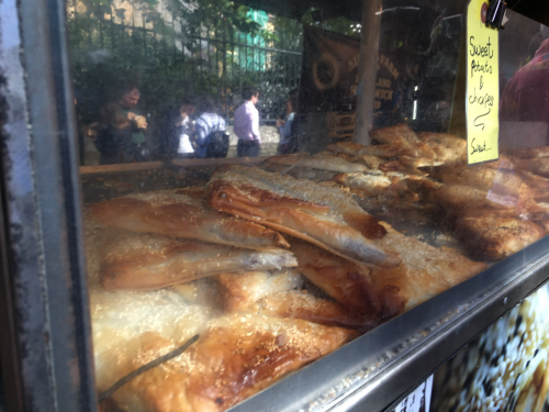Then we had lunch! At first we thought we might find a table in one of the restaurants around the edges, then we thought we might leave to find a restaurant, and finally Mark decided he would stake out a spot near a bench and keep the 3yo while the rest of us fanned out to find food. “Just buy me lunch,” he instructed, “well, lunch for you and for me and for the two little boys,” so I took the 7yo and headed towards where we had seen an array of sellers of hot food.