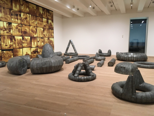 And this installation (it’s a long story; the artist started, performatively, by engaging a village to make wheaten wreaths for her annually; she had to stop; she tried different means to preserve the art somehow; she settled on sealing the wreaths in metal “tins” in which they are presumably decaying.)
