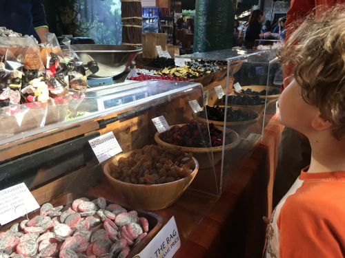 Off to Borough Market, which at around eleven was not quite a complete crush of people. We had to pass through a crushing bottleneck at one end, where we were squeezed between a wall and a bar with outdoor seating (I glimpsed a tray full of brimming pitchers of Pimm’s Cup but was not able to stop and neglect my family long enough to run up to the bar and ask for one).