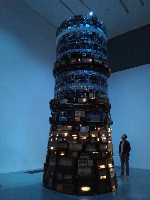 And this, a sort of Tower of Babel made of old radios, all tuned to different stations: