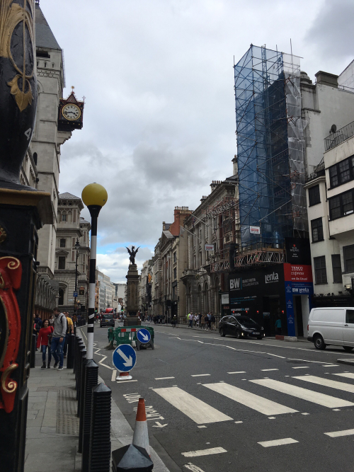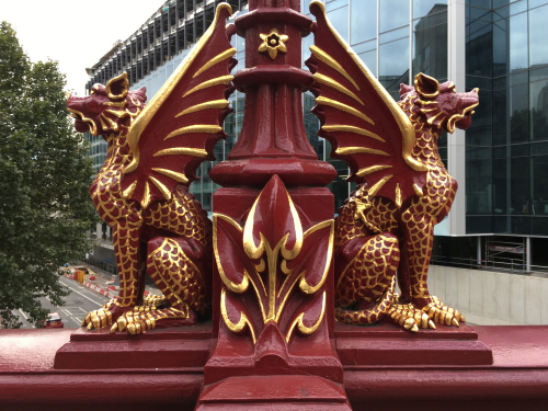 I crossed the Holborn Viaduct, its rails brightly painted, studded with these dragons that remind us we are within the jurisdiction of the ancient City of London. A worker on the opposite side of the bridge had a big fluffy duster on a pole, and was carefully dusting the metal lions at the other end.