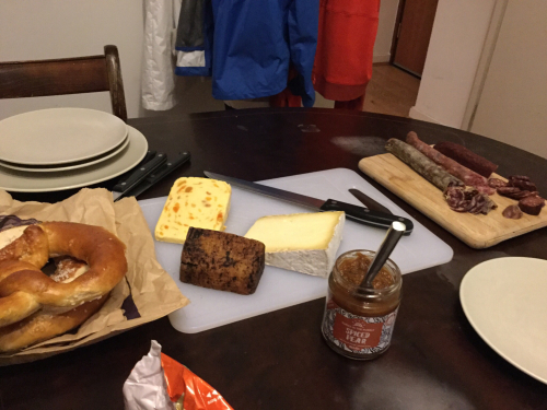 Pretzels, cheeses and chutneys from Borough market, apricot Wensleydale, saucissons. And hummus and veg and cut mango and blueberries and crackers and Irish soda bread and leftover chicken soup. And a bottle of red wine, Montepulciano from a store somewhere around here.