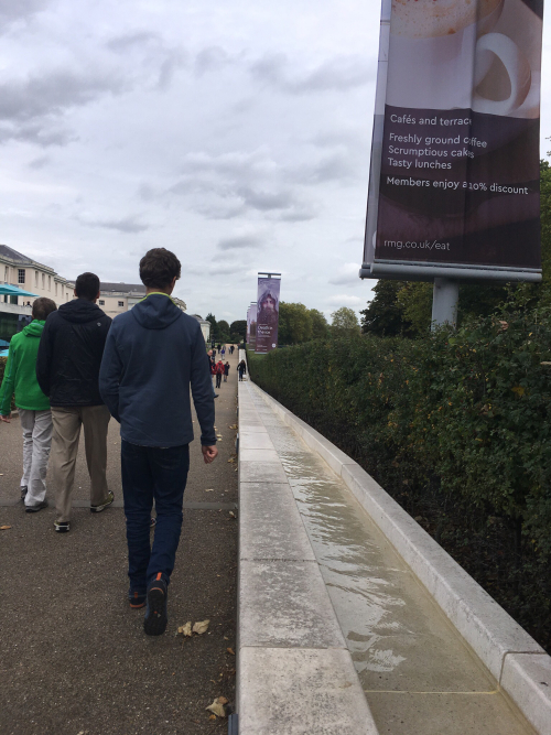 The approach has a long trough of running water coming from each side and meeting at drains in the middle. It would be a good place to sail a paper boat. The children threw autumn leaves in it to amuse the 3yo.