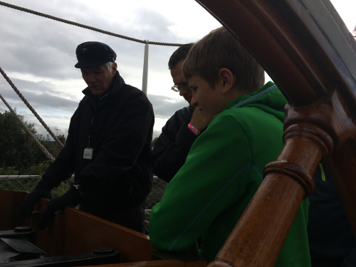 Mark spent a lot of time admiring the mechanism that converted rotation of the wheel into rotations of the rudder. I was chasing the 3yo at the time and missed most of the explanation from the docent in the cap.
