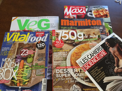 Not much to explain here! Most of these are cooking magazines, and one is sort of a French equivalent of Scientific American. I set reminders on my calendar to dole them out to myself at the rate of one every two months.