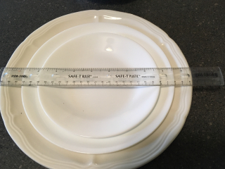 Shown below, stacked from bottom to top: (1) a "standard" 10-3/4-inch dinner plate, (2) our dinner plates, (3) the plates we typically use for first course (or for a bread plate if we're having soup):