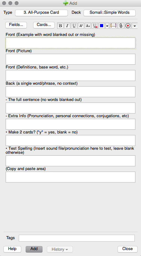 Furthermore, Gabriel Wyner is offering among his free resources a few templates for useful Anki flash cards which helped me get very quickly up to speed. These range from simple picture-word cards for learning concrete vocabulary terms, to more complicated flash cards that have you insert the correct ending for a partly-blanked-out conjugated verb. The template for creating an "all-purpose card" looks like this:
