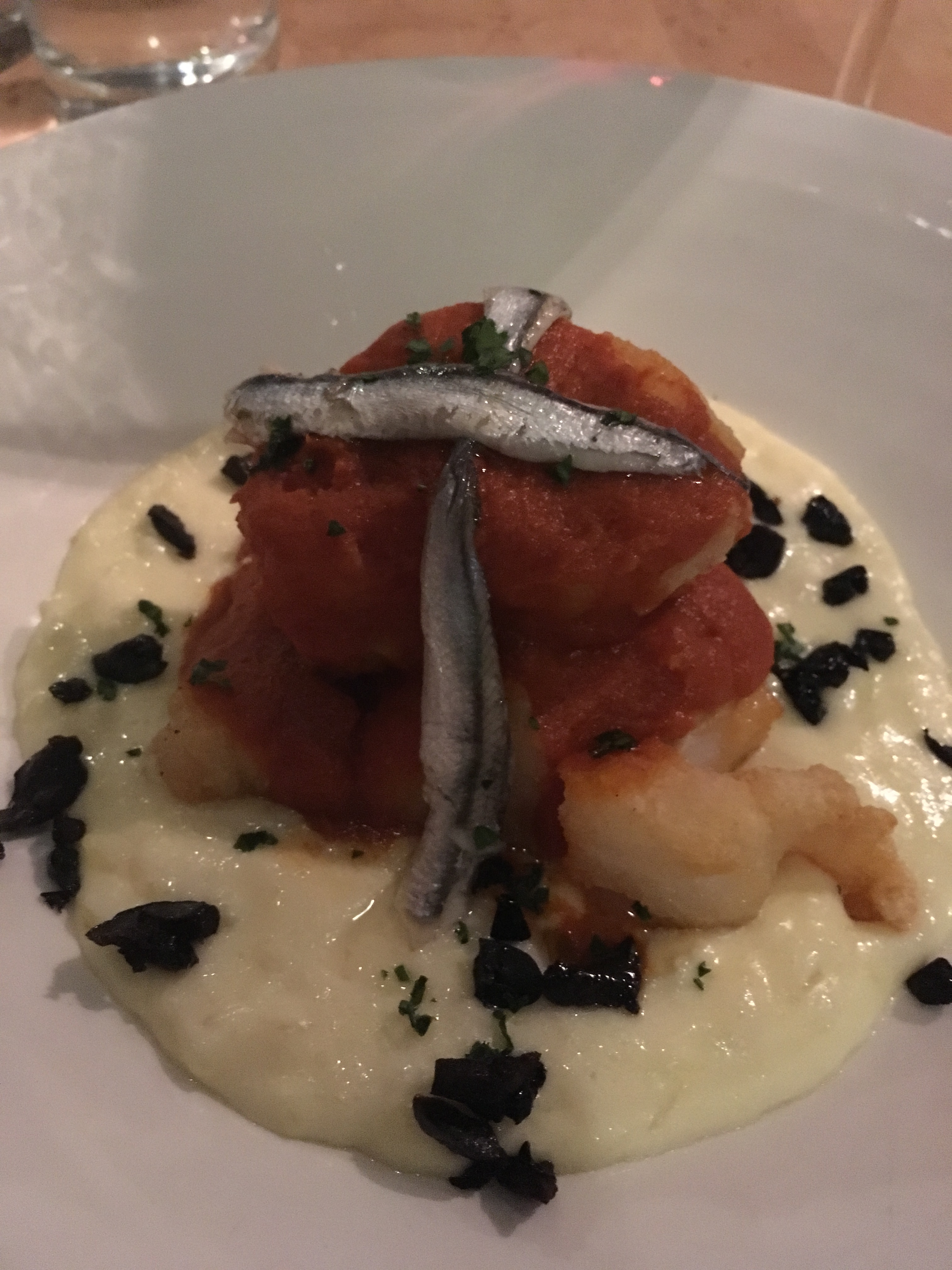 I went with cod puttanesca this time, trying to hit the perfect fusion of New England and Italian food. No pasta: cod on a bed of ethereal mashed potatoes, with the sauce deconstructed: thin tomato sauce, olives scattered about, anchovies draped over. Cod and potatoes go together like nothing else, and the light application of the strongly flavored elements of the sauce made it just about perfect.