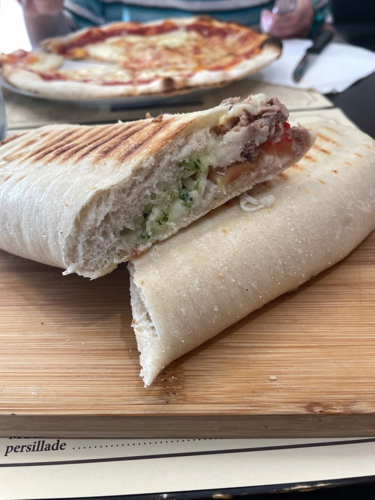 We ordered a pizza for Simon and paninis for us, and while Mark did phone searches to try to confirm that our rental SUV would not exceed the 1.8-meter height limit of our parking garage, I studied the placemat menu to learn about the types of pizza available here. Many were familiar from Menton or other places, but a few were novel. I posted a pic straight to IG.