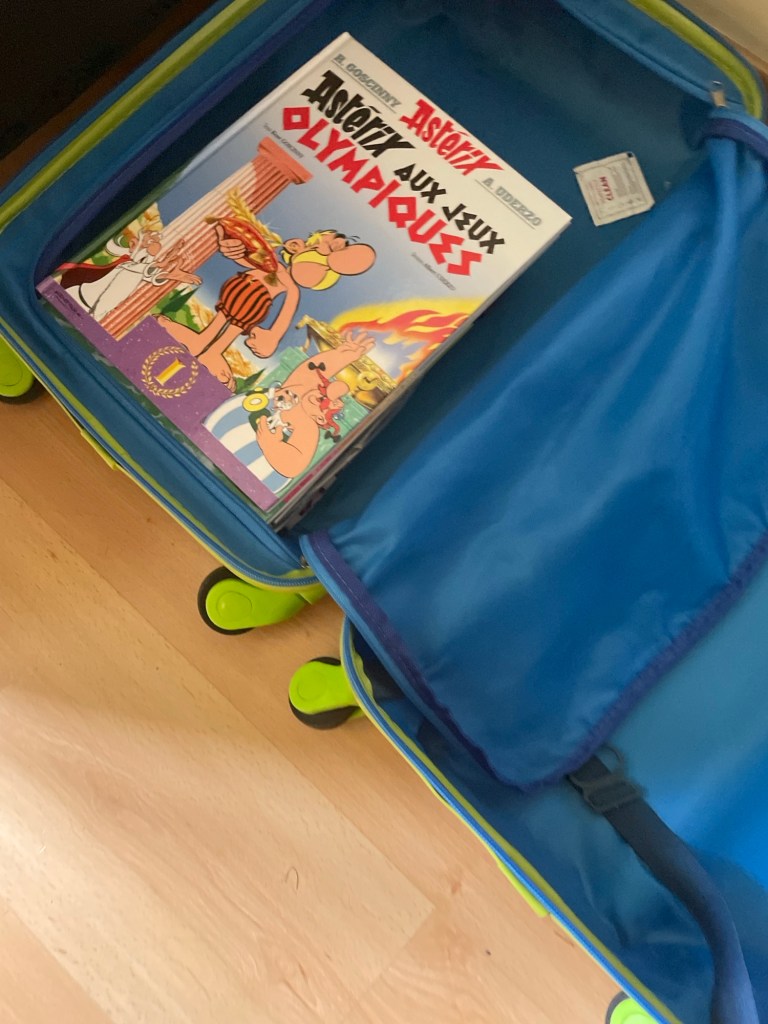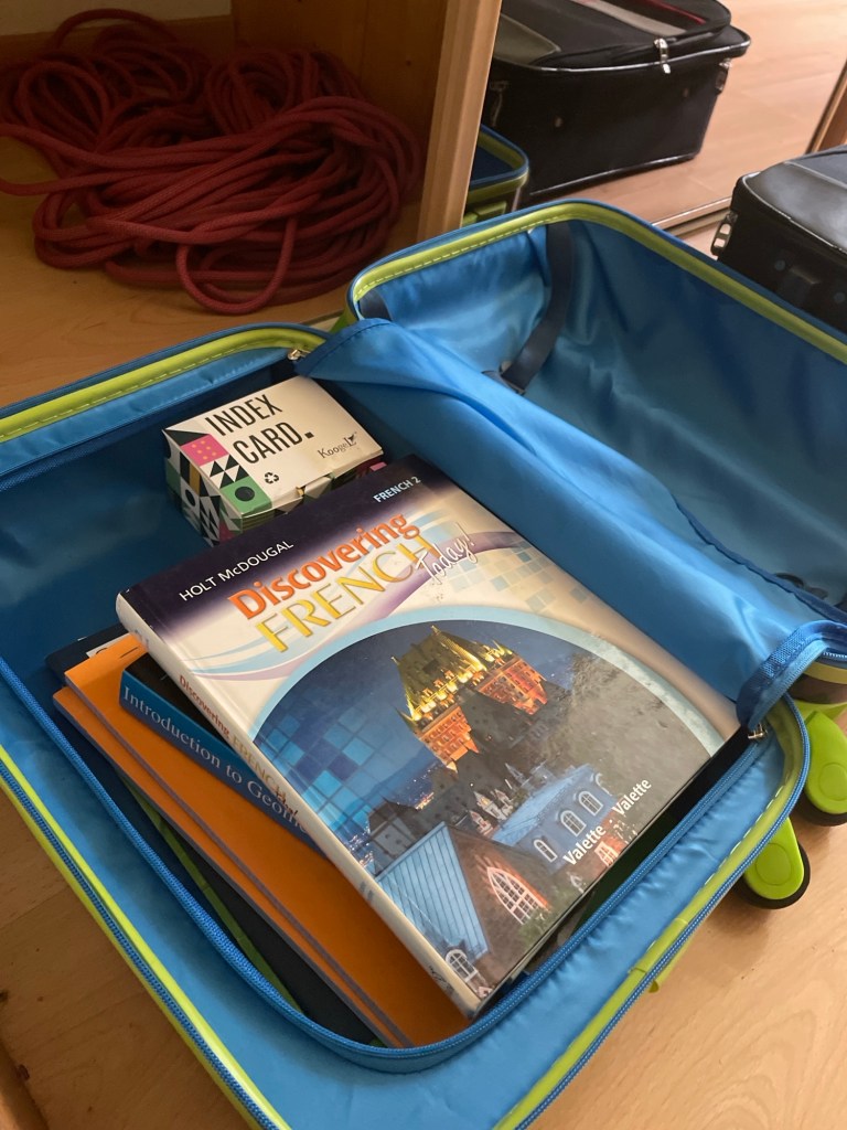 Our school load is real but simplified enough here that I’ve been able to work with Simon in the morning and Leo in the late afternoon. And yesterday was the last workday! So when it was over I packed up all the schoolbooks into the rolling carry-ons.