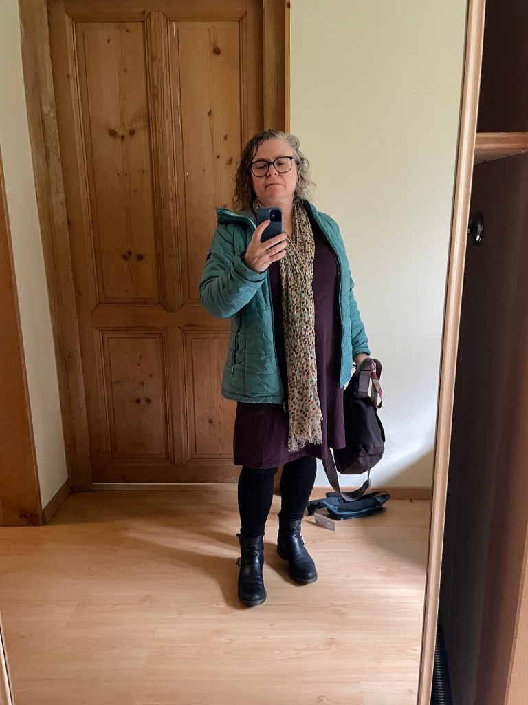 So, like, this purple wool dress is about as dressed up as I get here. With the turquoise puffy, very appropriate for around here. I happen to have a scarf that has both turquoise and purple in it. It makes me feel pulled-together.