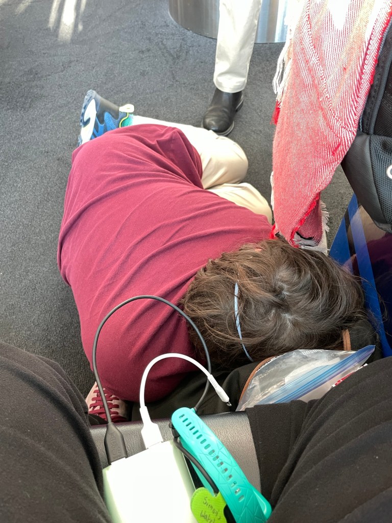 I’d never noticed before, but there is a secret pair of audio jacks overhead of a seat in the middle of the plane—row 24 in this A220-100—which allows the crew to connect a Medical Headset with a very long yellow cord that can go from there all the way to the back. We were in that row, and the flight attendant enlisted Mark’s help in getting it connected since the jack was right over his head. One of the medically trained passengers took it and put it on with the crew’s help before heading back. The crew member followed, draping the cord over the back of Leo’s seat and into the aisle.