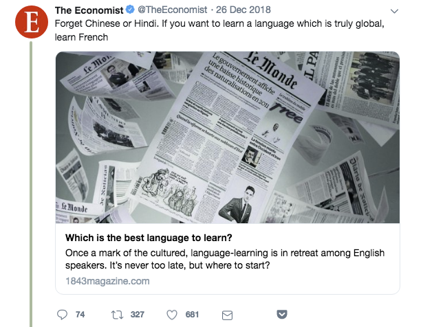 A couple of weeks ago The Economist tweeted out a link to an 2012 article from their lifestyle arm, 1843 Magazine, entitled "Which is the Best Language to Learn?"