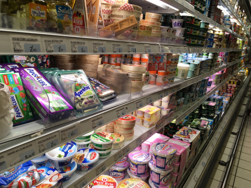 I stopped at a store as I had promised, and bought things for breakfast: milk and granola (“muesli croccante con pezzi di frutti,” crunchy muesli with fruit pieces), square white bread, plain yogurt and fruity yogurt, and some plums.