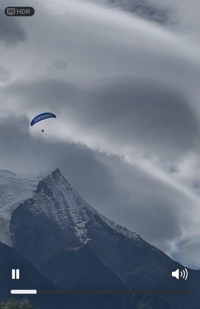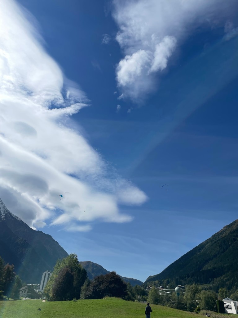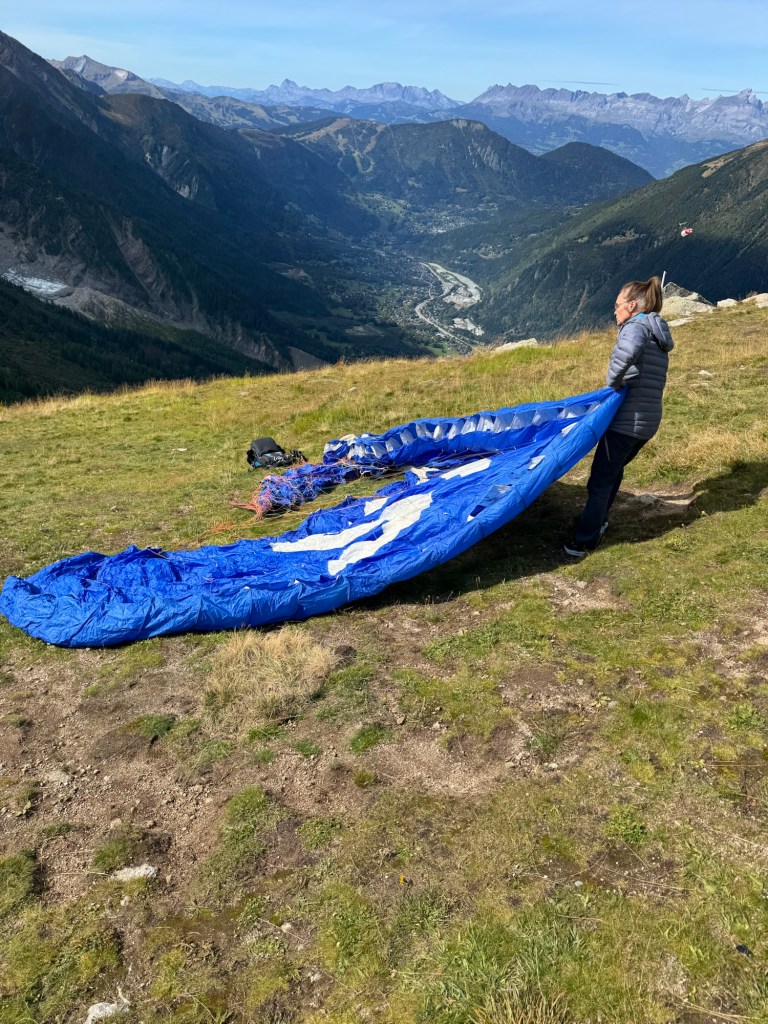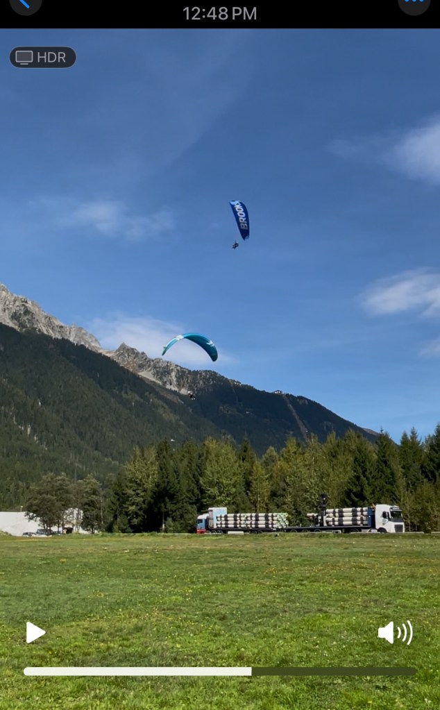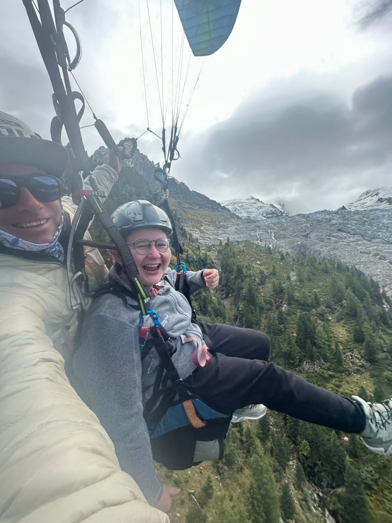 And Mark explained that we had connected with the same person we’d hired before, whom we’d met through another English-speaking family we ran into on our first trip to the area. “We feel like we’re really in good hands with Sandie. She’s a world champion parapenter and has European and French titles as well,” Mark typed. (In fact, she piloted the Olympic torch down from the Aiguille de Midi in 2024 as part of a Chamonix relay team of 24 torchbearers. Article and video here!)