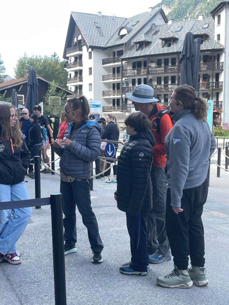 We met Sandie at the Aiguille de Midi gondola station in town, fresh from the pastry shop. I had bought tickets for Mark and the boys: aller-retour (up and back) for him, aller simple (one way) for them.