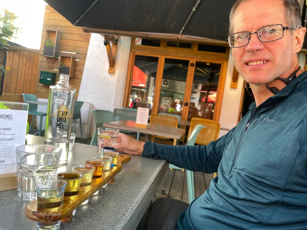 I knew which one they meant. There’s a restaurant called L’Hydromel which is not only a restaurant but a meadery. (“Hydromel” is mead.) They were in business last time we came to Chamonix, and back then I ordered the tasting flight of six meads to try, which was fantastic, if you ever have a chance to taste six different meads at once I highly recommend it. There’s far more variation in flavor than you might expect.