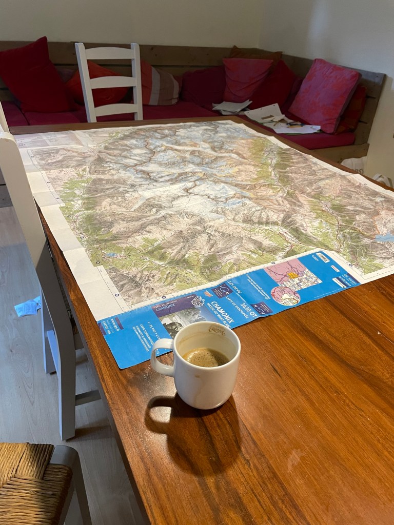 Yesterday we wanted to go up into the mountains to hike around. We googled a few “easy/family hikes,” then spread out the Chamonix Valley topo/hiking map on the table to look at some of the candidates.