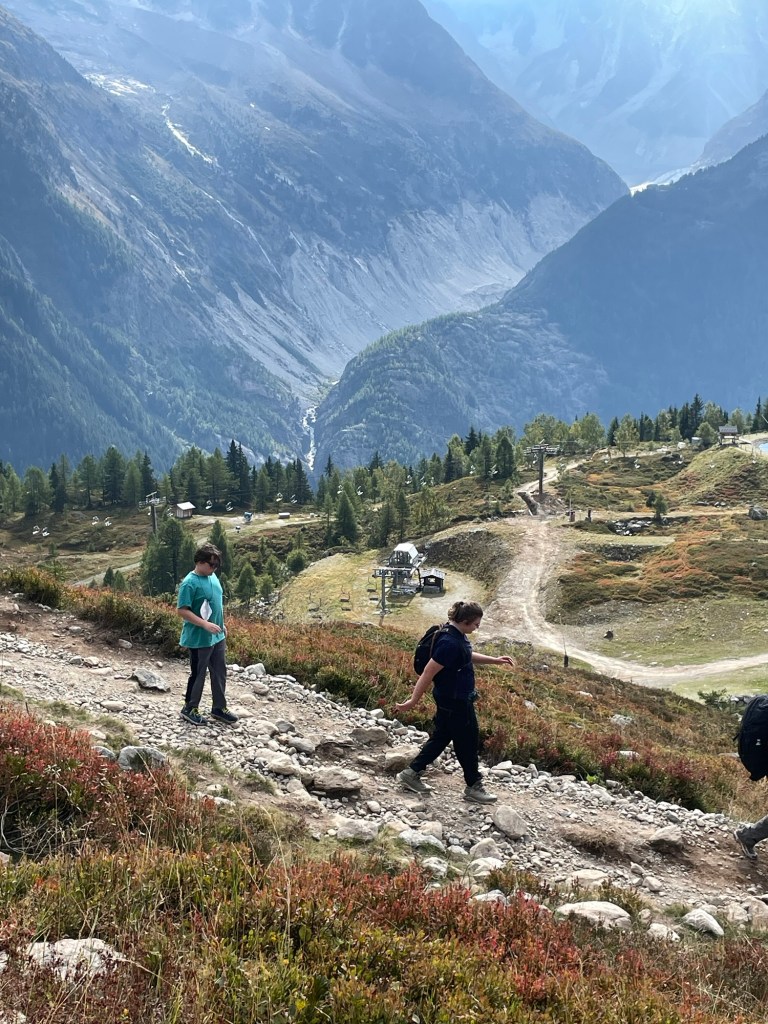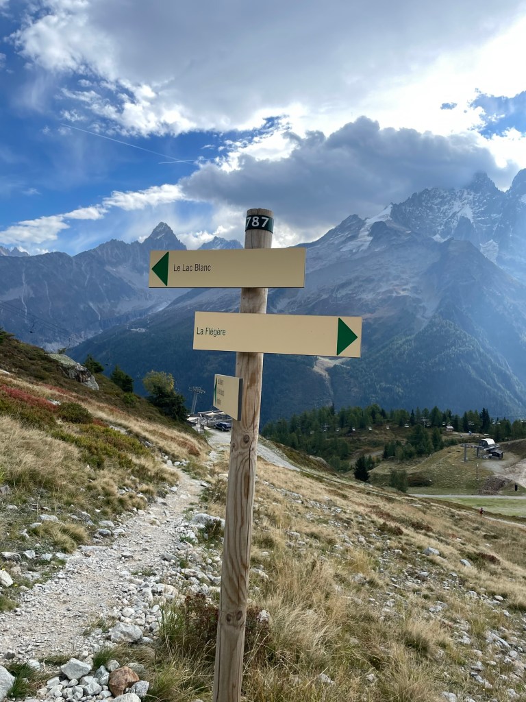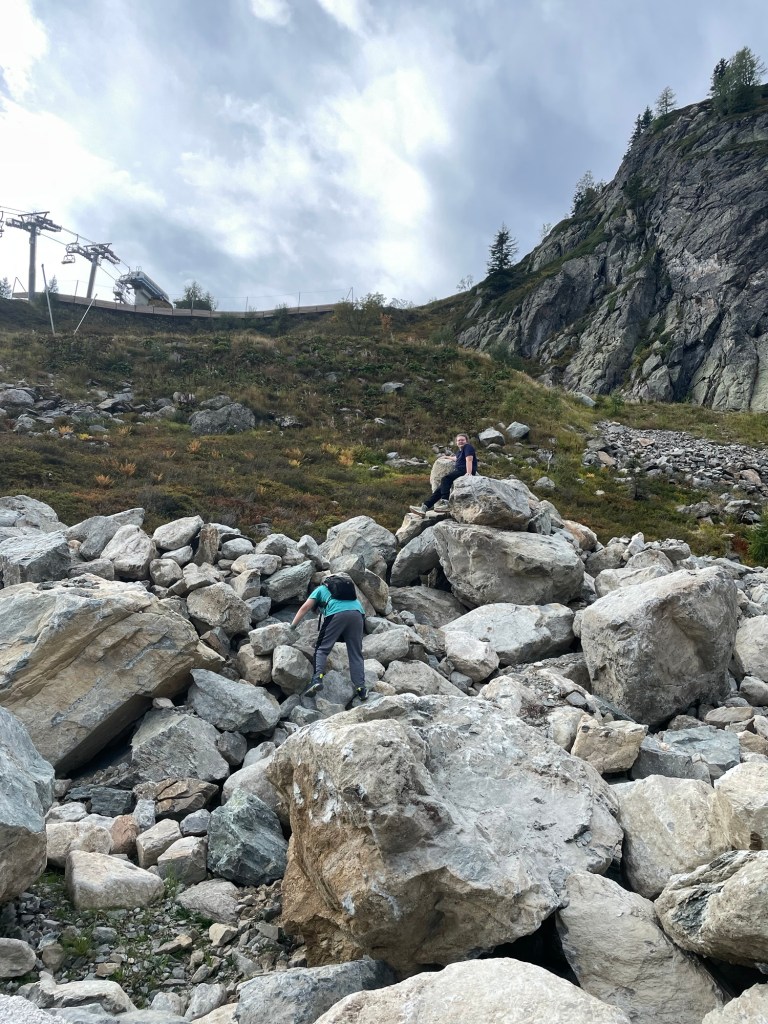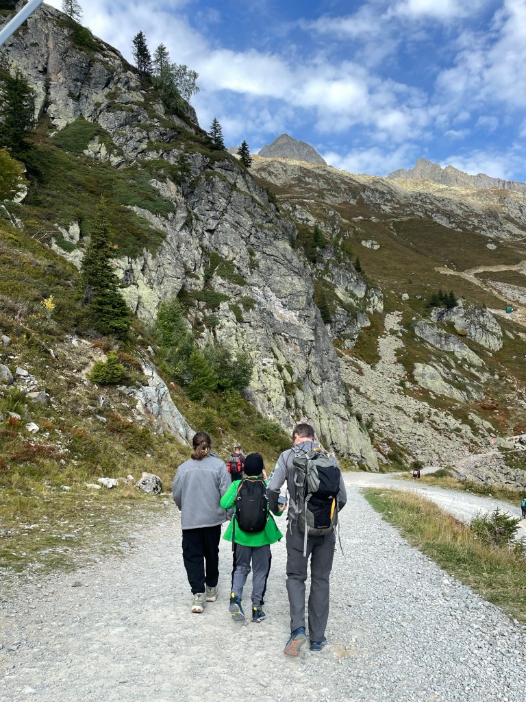 It was the last day of the season for the La Flégère gondola, and none of us remembered ever taking that one before. There were several trails leading off from there, including one that would be a challenge for us but not impossible. 3 km out and 600 m climb to Lac Blanc, then back. We told the kids we would turn around if it felt like too much.