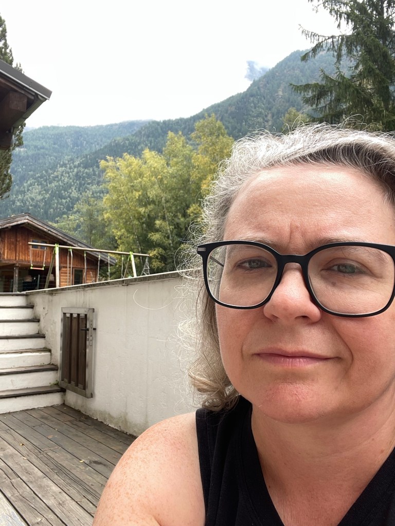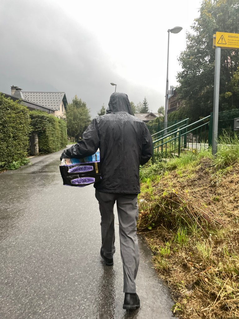 I sat on the back deck, sunken below the yard, on my phone, listening to the river roaring a few yards away, and the train coming by every once in a while. Watching clouds come boiling down from the Mont Blanc side into town. Eventually it started to rain, so I came in (and texted Mark about the weather; up in the opposite foothills, Mark prepared to turn back).