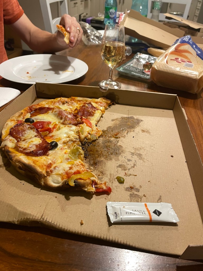 Several pizza boxes with partial leftover pizzas. Both towns we have stayed in were near the border with Italy. Lots of pizza to be had. Lots of pizza leftovers.