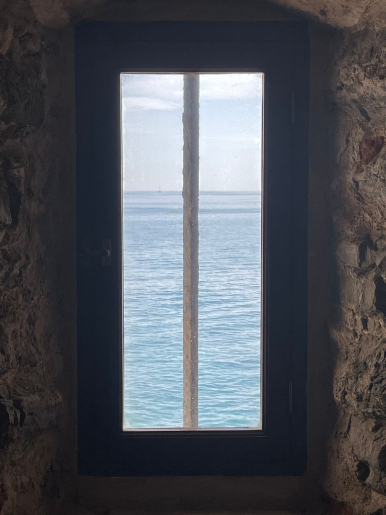 The old town is toward the east, and that’s where the winding streets and the picturesque stairs and the high concentration of restaurants are. We thought we’d like to stay at that end, but the best apartment for us we found on the west end, on a wide boulevard that comes straight down from the train station. No matter: it is a 15-minute walk to the old town. All along the seaside is a string of stony beaches and bars and gelaterias; or you can sidestep one block inland and walk along a street that’s a mix of touristy shops and ordinary shops like pharmacies and hardware stores and sporting goods stores.